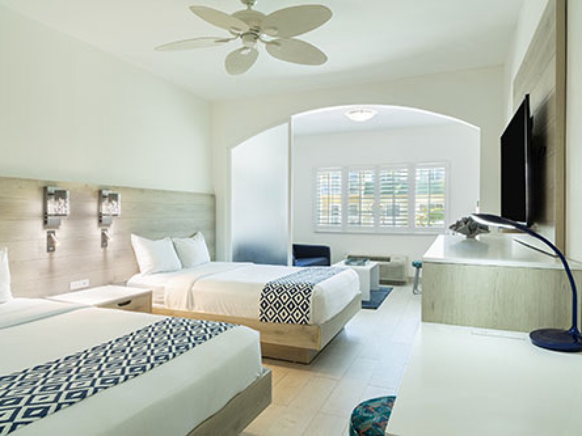 There are 98 newly refurbished studio rooms, approximately 295 – 325 sq ft, offering pool views (some with balcony or terrace) and others with garden/island views. Rooms in two three-story buildings (no elevator) surround a lush tropical pool area that creates an intimate boutique setting. All rooms feature new furniture, upgraded bathrooms, a sitting area with a full-size sofa bed, 2 chairs, and an activity desk. Wireless Internet access is available throughout the property. and all stays include a complimentary continental breakfast. On top of the daily offerings of cereal, toast, pastries, yogurt, assorted fruit, and beverages, guests can also expect a hot item daily, such as eggs with bacon or sausage.